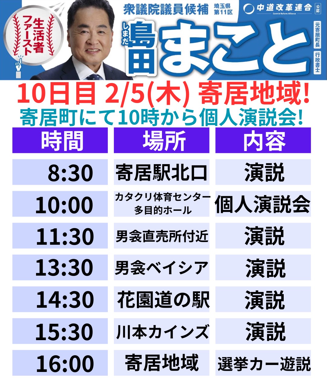 2026年2月5日(木) 行動予定 寄居・男衾・花園道の駅の皆様よろしくお願いいたします。