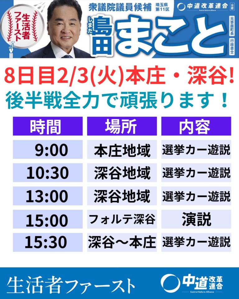 2026年2月6日本庄市内にて 投稿日 2026年2月6日 著者 島田まこと事務所 カテゴリー 衆議員議員選挙 中道改革連合 島田まこと 2026年2月6日本庄市内にて 生活者ファースト で物価高対策や政治改革を実現! 暮らしを真ん中へ! 生活者を政治の「ど真ん中」に据えます! #中道いいじゃん #島田まこと #中道いいじゃん #島田まこと #中道いいじゃん