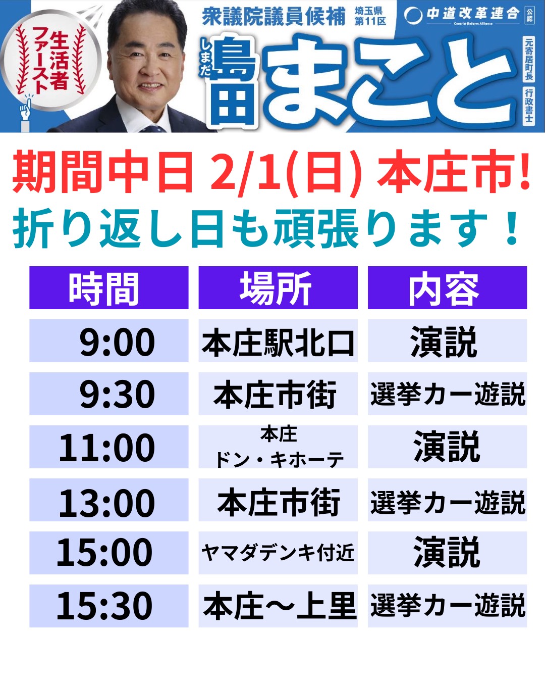 2026年2月1日(日) 行動予定 本庄市の皆様よろしくお願いいたします。