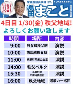2029年1月30日 島田まこと 選挙戦4日目 行動予定 投稿日 2026年1月29日 更新日 2026年2月3日 著者 島田まこと事務所 カテゴリー 衆議員議員選挙 中道改革連合 島田まこと 2029年1月30日 島田まこと 選挙戦4日目 行動予定 生活者ファースト で物価高対策や政治改革を実現! 暮らしを真ん中へ! 生活者を政治の「ど真ん中」に据えます! #中道いいじゃん